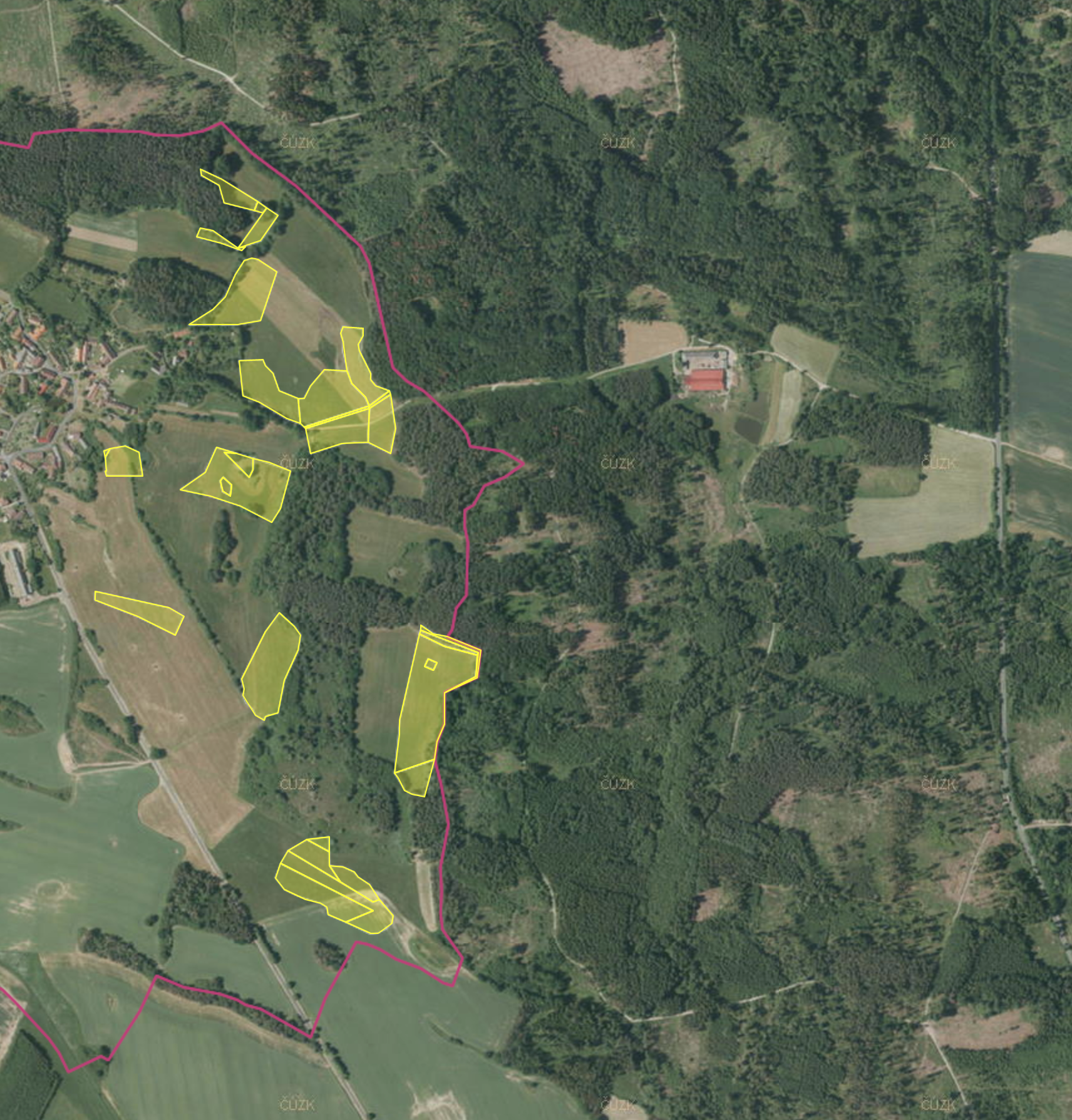 Jedná se o 47 pozemků ve výlučném vlastnictví parc. č. 94, 95/5, 112/1, 112/2, 116/22, 153/1, 153/4, 155, 165/4, 165/28, 178, 190, 191, 197, 301/2, 309, 360, 361, 554, 555/2, 556, 557, 583/1, 584, 596/1, 596/2, 596/4, 597/2, 598/1, 598/4, 610/1, 610/2, 610/3, 613, 614/2, 616/2, 620/1, 620/2, 621, 622, 677, 681/5, 681/10, 682, 706, 707, 709 zapsaných na LV č. 354.