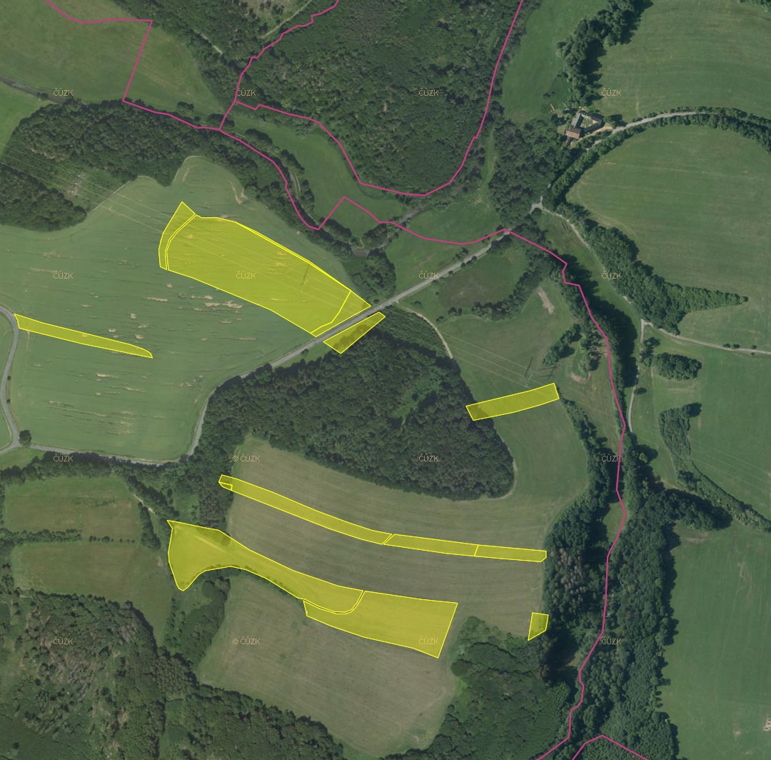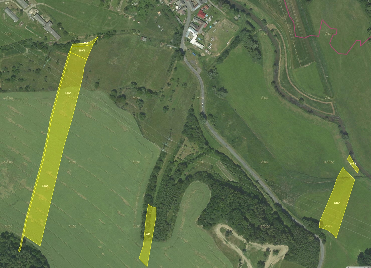 - v polovičním podílu (1/2) – parc. č.: 408/2,409/1,409/2,418/1,441,542/1,660/11,660/14,660/17,662,698/16,710,778,790,792/1,792/2,793/1,793/2 zapsané na LV 624